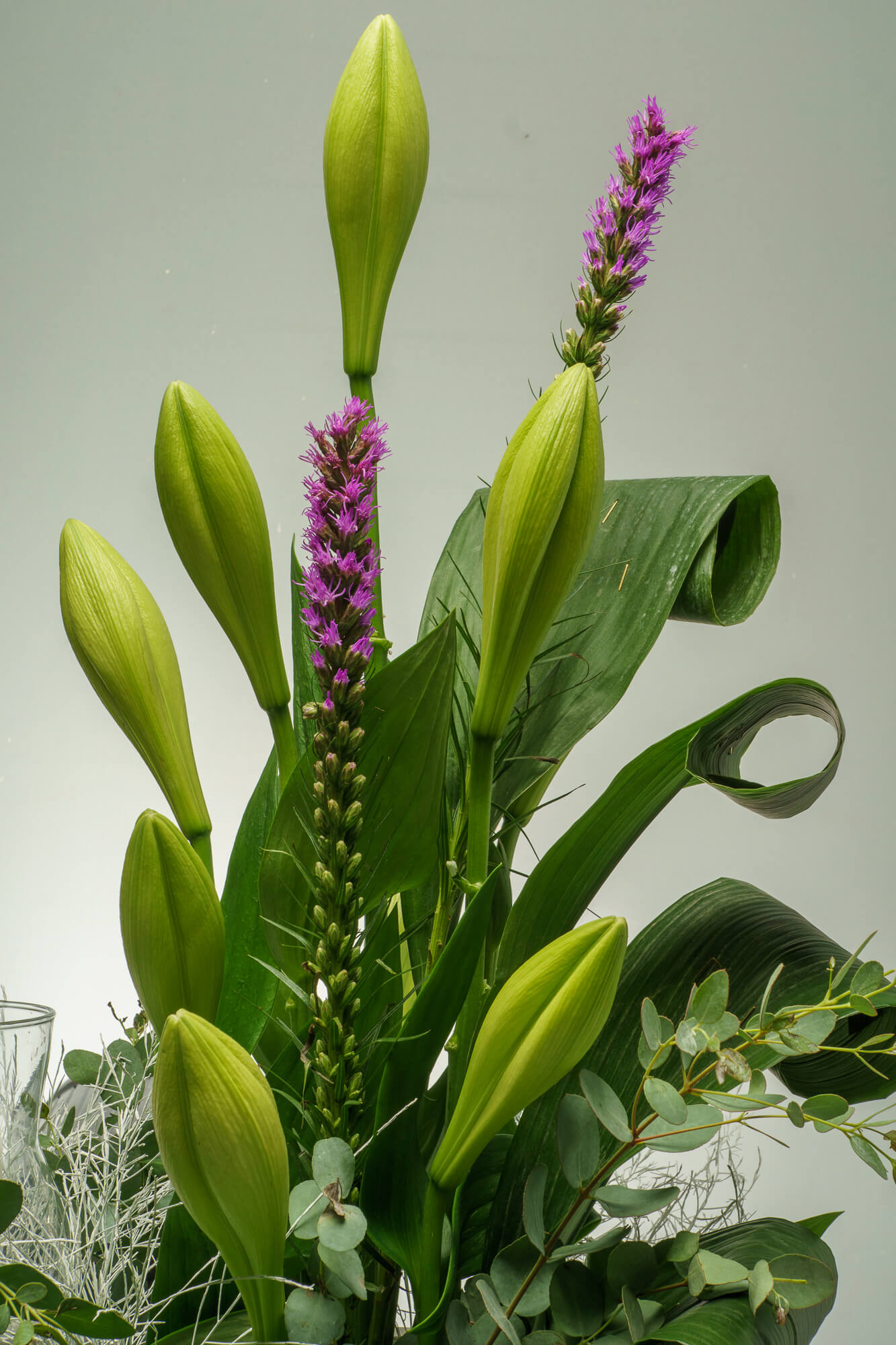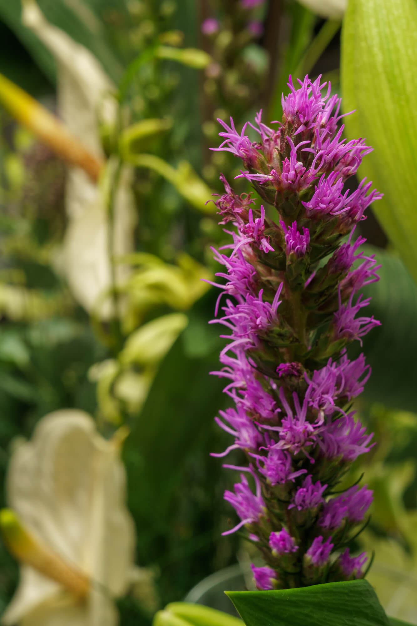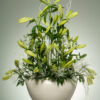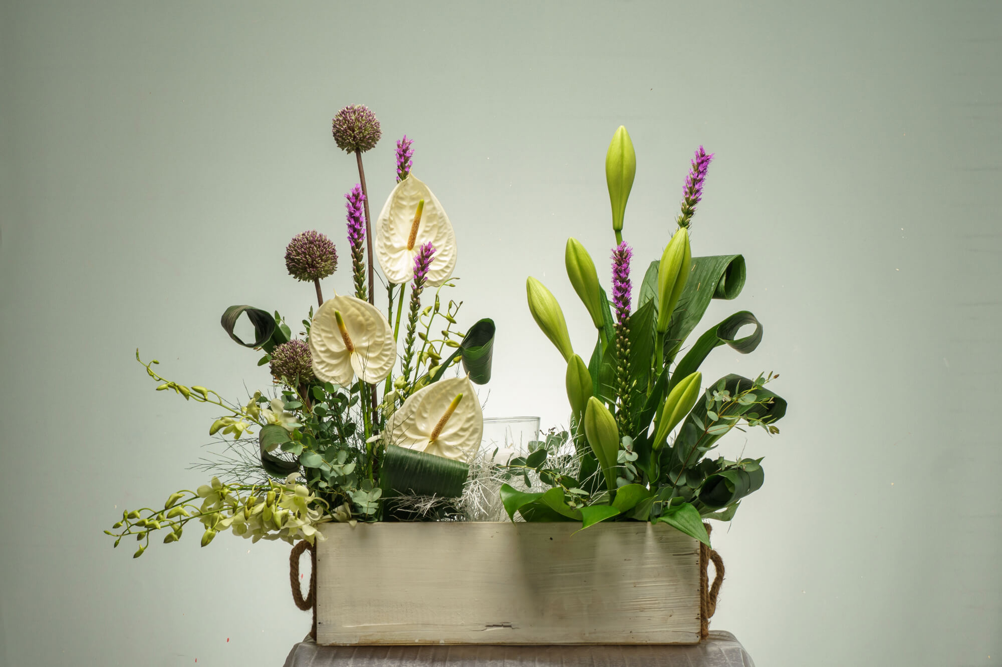 Μακρόστενη σύνθεση τελετής με λευκά ανθούρια, λευκό τριαντάφυλλο, λευκές ορχιδέες, οριεντάλ, λιάτρις, άλιουμ, κερί σε λαμπόγυαλο και διάφορες πρασινάδες.