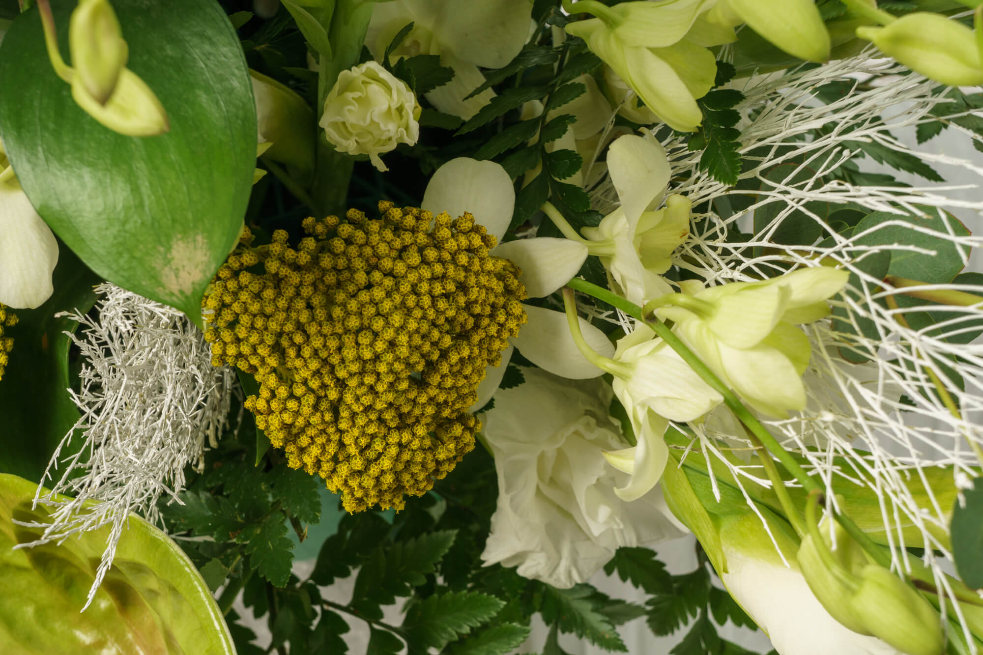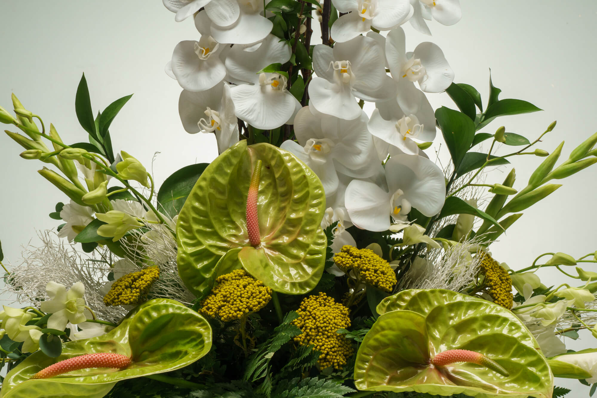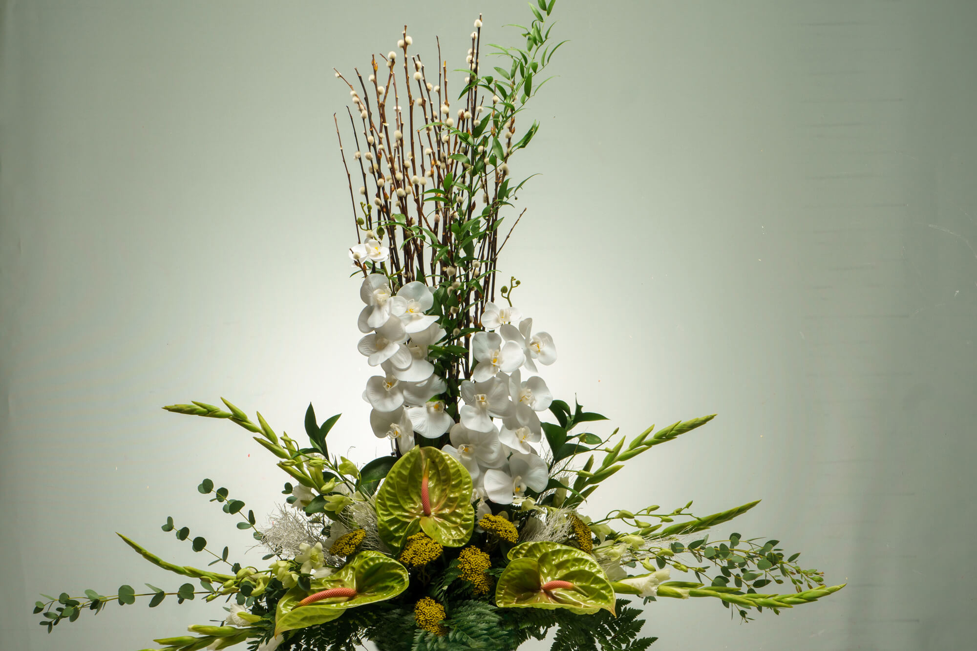 Μεγάλη σύνθεση τελετής με λευκή ορχιδέα φαλενόψις, πράσινο ανθούριο, ευκάλυπτο και διάφορες πρασινάδες.