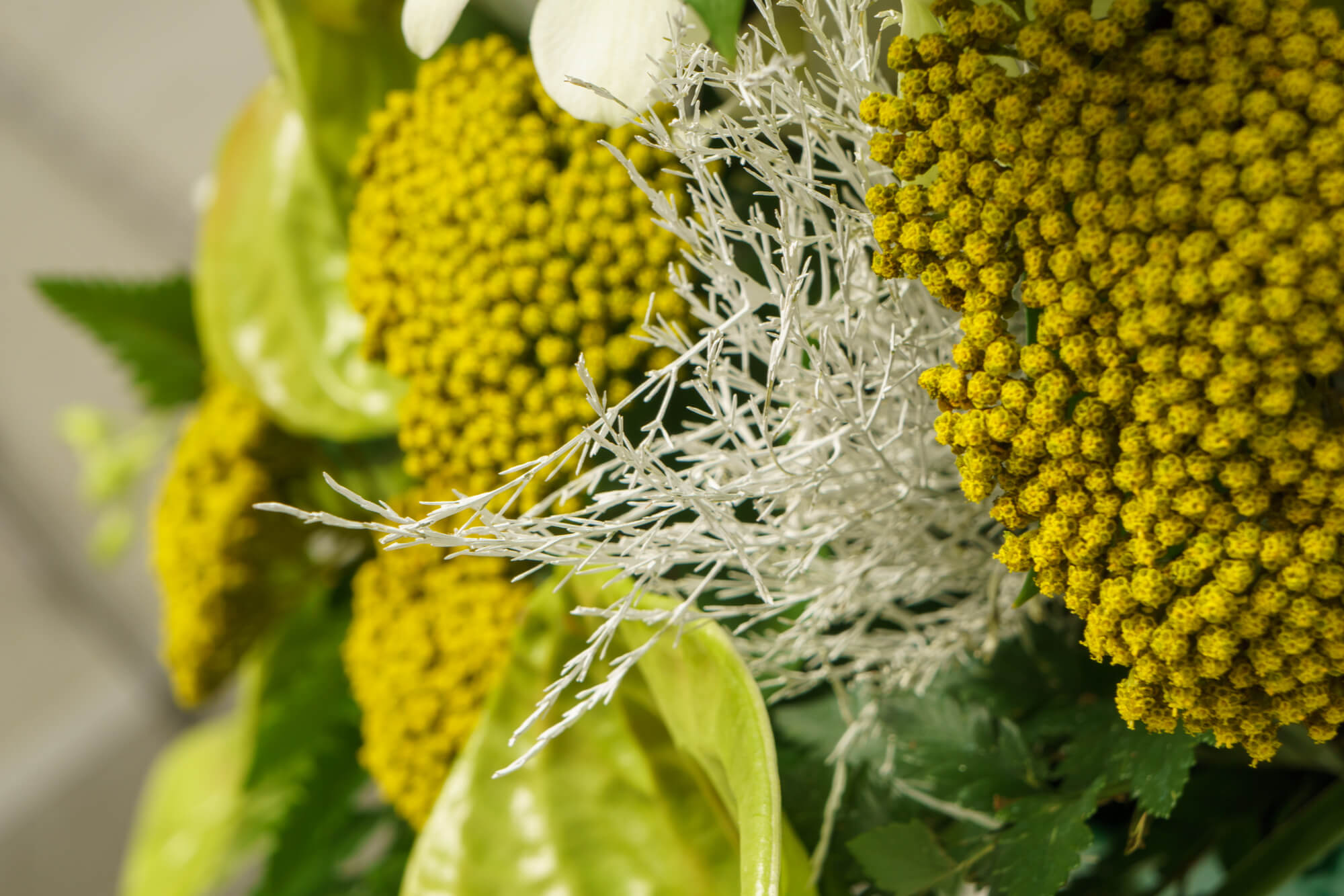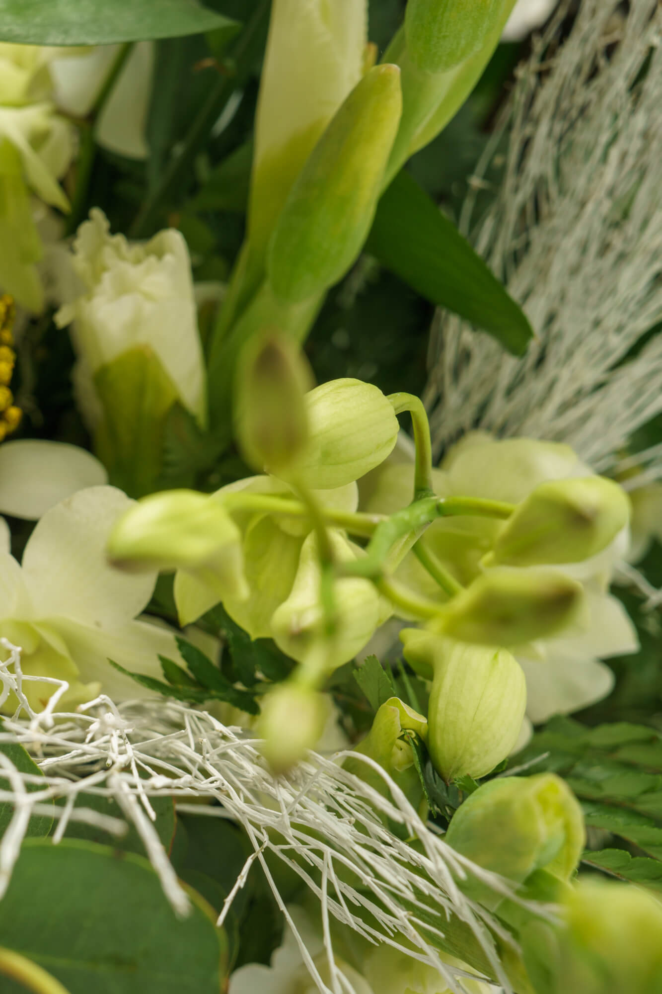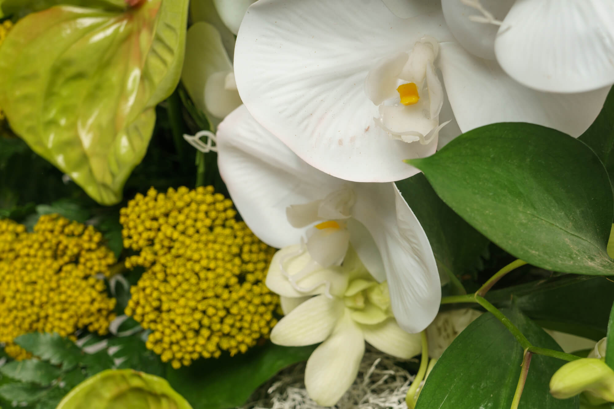 Μεγάλη σύνθεση τελετής με λευκή ορχιδέα φαλενόψις, πράσινο ανθούριο, ευκάλυπτο και διάφορες πρασινάδες.